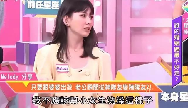 Melody曾公开透露,虽然嫁入了豪门,就像个保姆一样伺候着一家人,她每天早上5点半就要起床买菜做饭,工作完还要陪孩子补习。吐槽老公吴育奇大男子主义,不做家务,旅游的时候需要老公一起照顾孩子,他就会找各种借口逃避,比如腰酸背疼、不能给女儿洗澡,Melody觉得简直就是个“猪队友”。