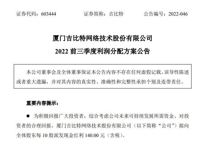 另据吉比特发布的《2022前三季度利润分配方案公告》,公司拟以实施权益分派股权登记日登记的总股本为基数,向全体股东每10股派发现金红利140元(含税)。截至目前,公司总股本7186万股,以此计算合计拟派发现金红利10.06亿元(含税),占2022年前三季度合并报表归属于母公司股东的净利润的比例为99.45%。