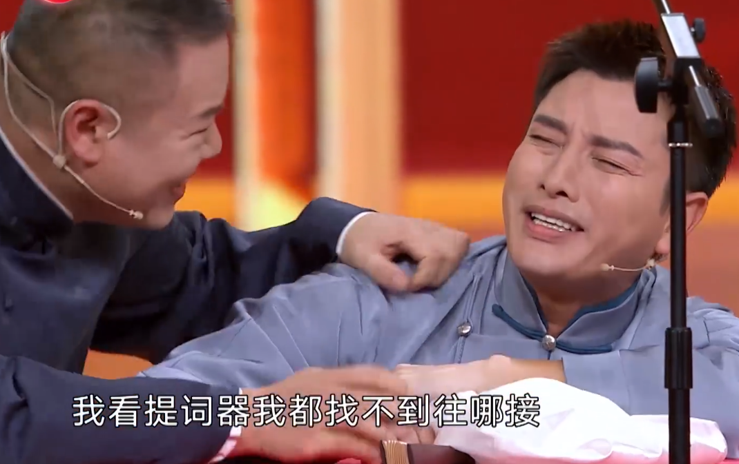 贾乃亮在台上都要哭了,说自己看提词器都不知道往哪接,最后求岳云鹏配合一下,缓和了之后贾乃亮已经满头大汗了,不过这段的逗笑效果也很不错啦!