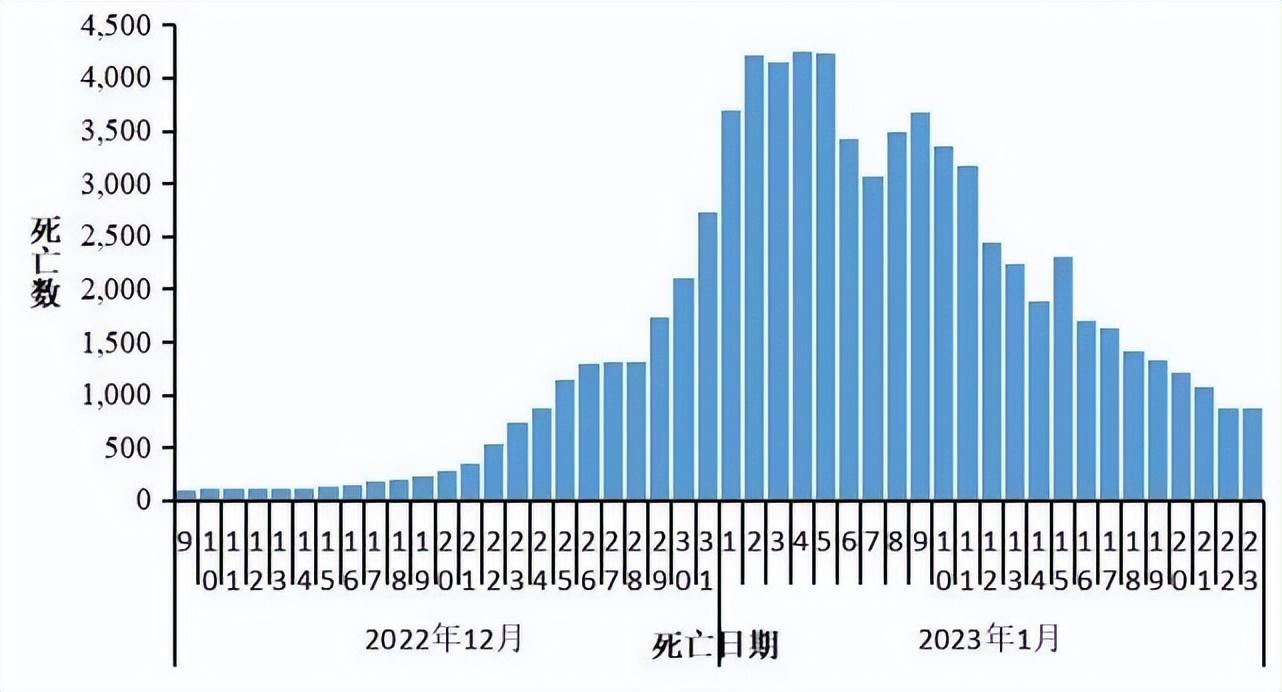 在院新冠病毒感染死亡病例数于1月4日达到每日峰值4273,随后持续下降,1月23日下降至896,较峰值下降79.0%(图3-3)。